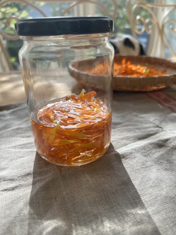 カレンデュラは、春先に咲くオレンジ色のこんもりした花。和名はトウキンセンカ。オレンジ色のカロテノイド色素やフラボノイドが複合的に働き、赤切れや肌荒れなど皮膚の炎症を癒してくれます。カレンデュラの花びらを植物オイルで漬けた美しいオレンジ色のオイルとミツロウで作られたバームは、万能軟膏とも言われています。