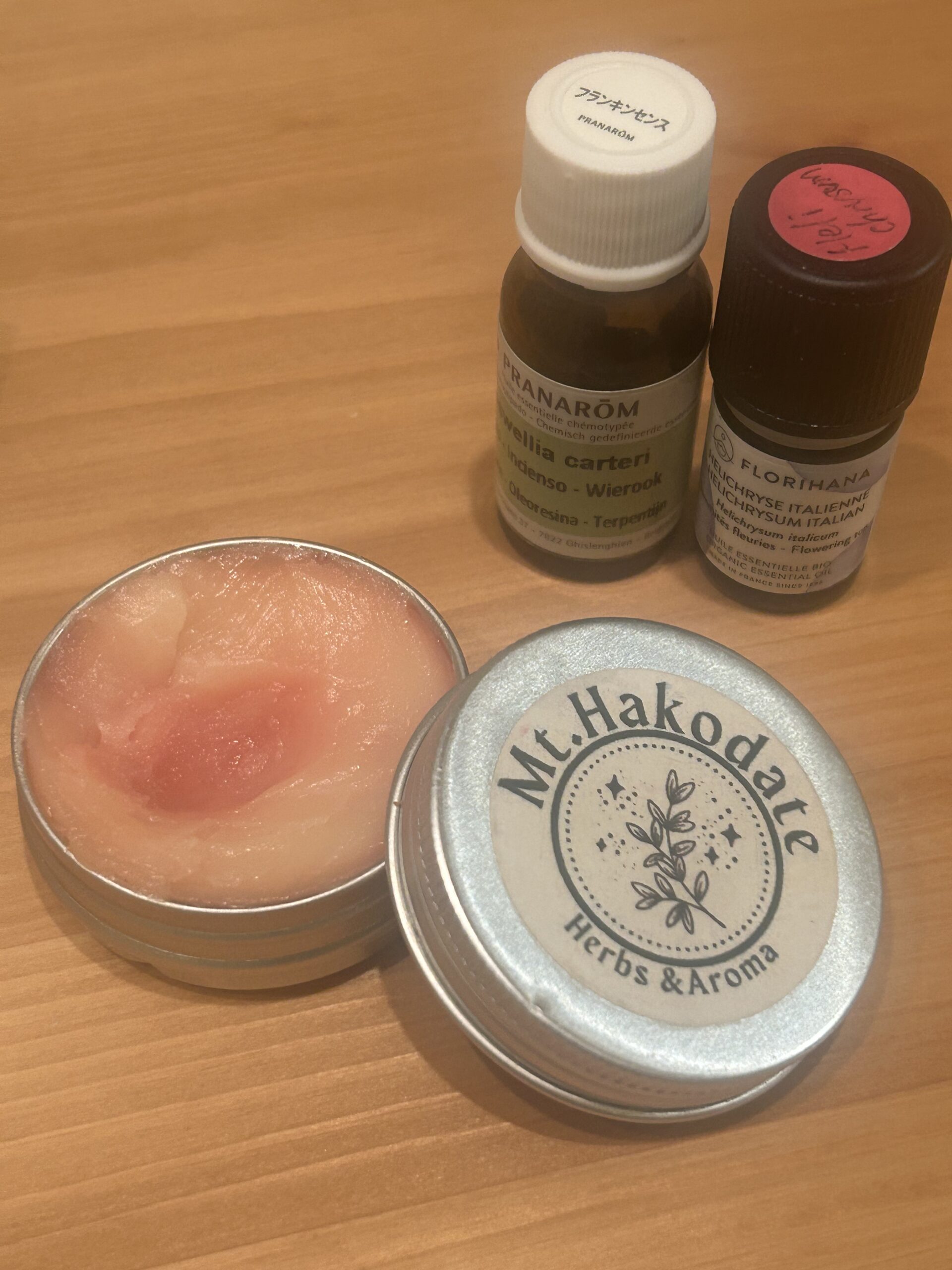 ところが、私のカレンデュラオイル&紫根バーム使ってみたところ(それぞれの余りをバーム缶に注いだだけですが…)、「おおー‼」っと効果を実感した様子。毎日、欠かさず塗っています。